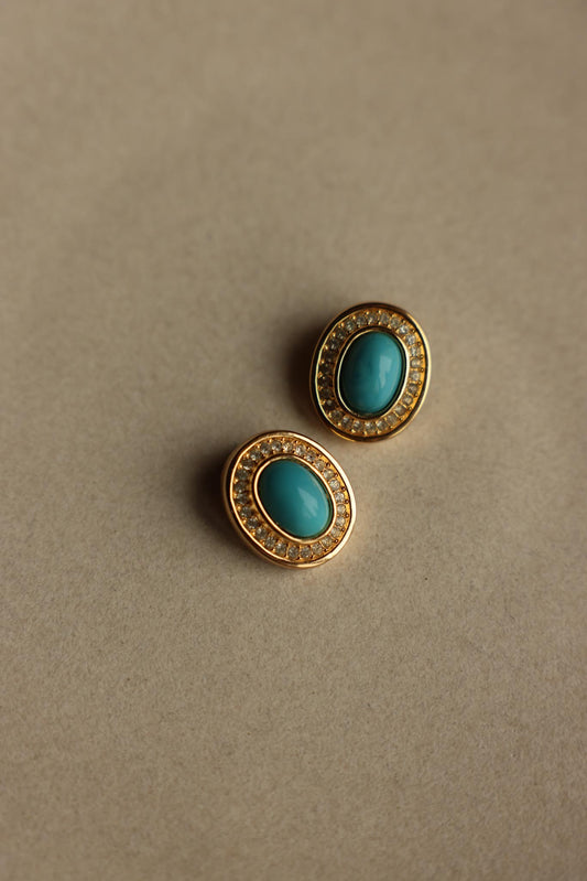 1980s Christian Dior Oval Turquoise Glass Rhinestone Gold Plated Clip-On Earrings