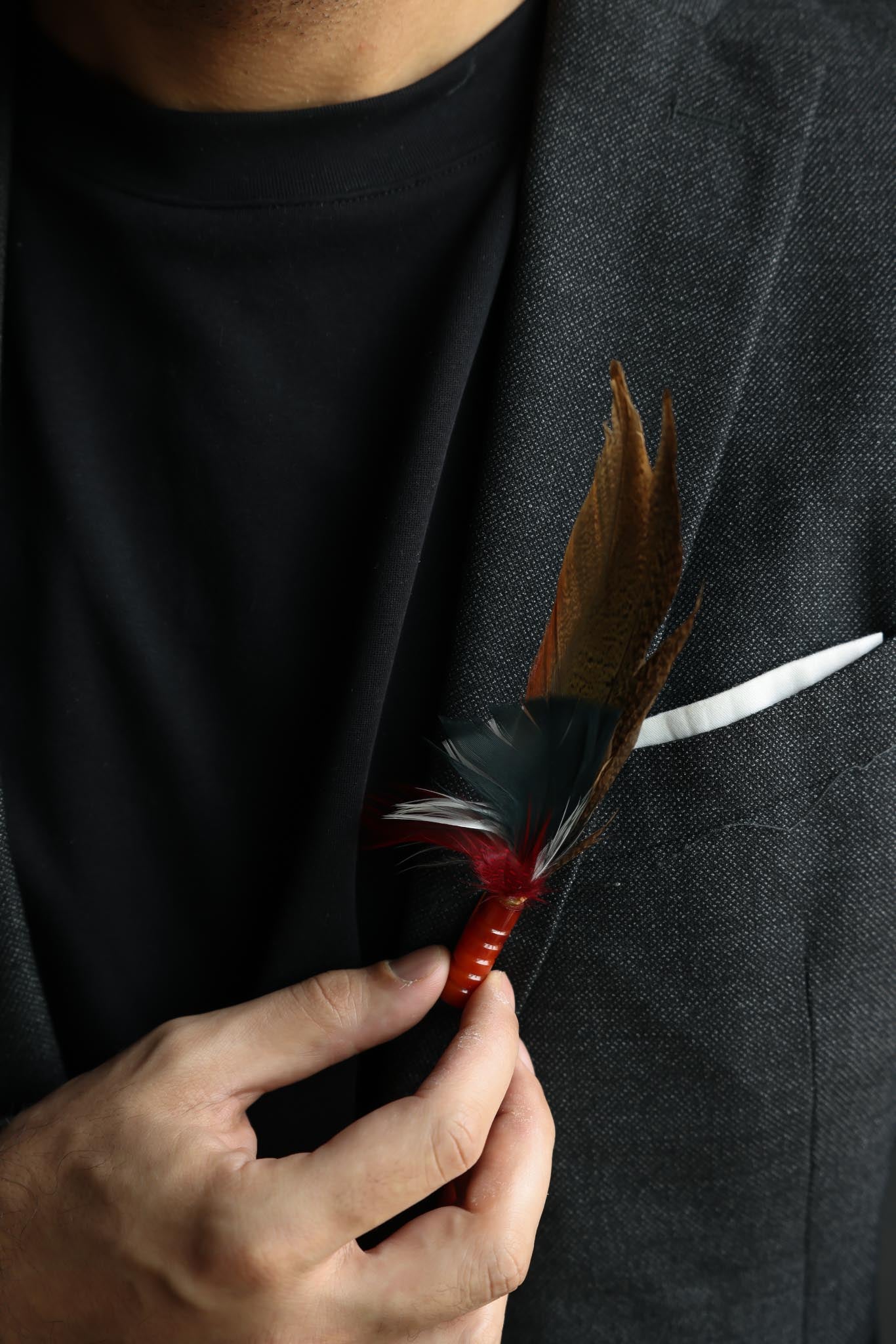 Decorative feather brooch featuring layered natural feathers secured with a red/orange plastic grip base. The brooch measures approximately 7 inches long and is designed as a statement accessory, suitable for wear on a lapel, hat, scarf, or outerwear. The elongated form and feather detailing create movement and visual impact when worn.