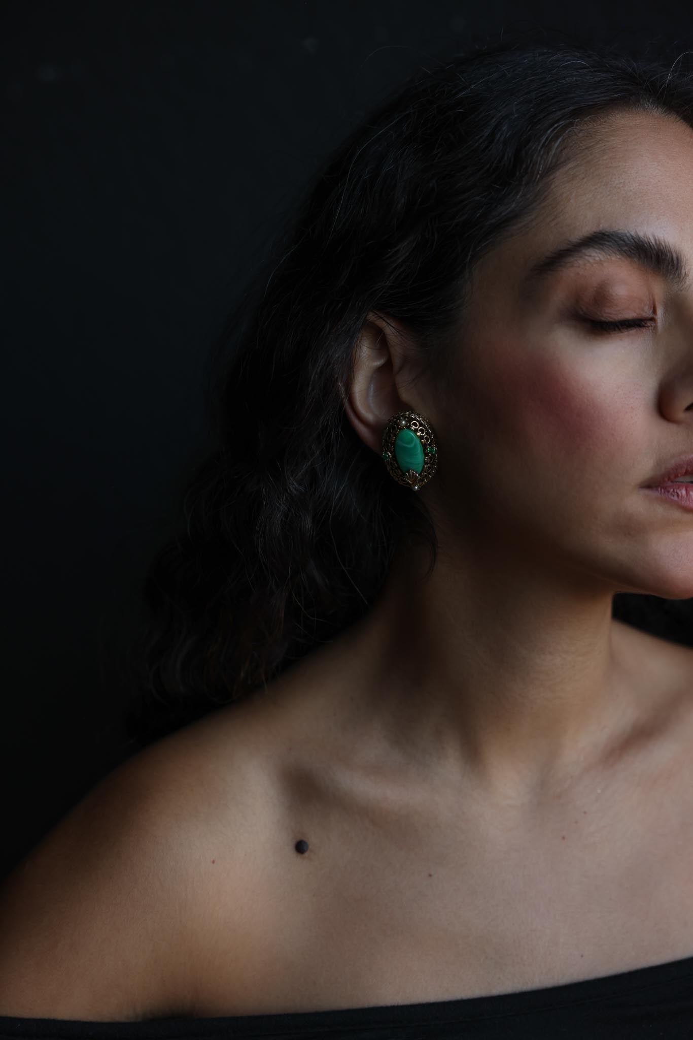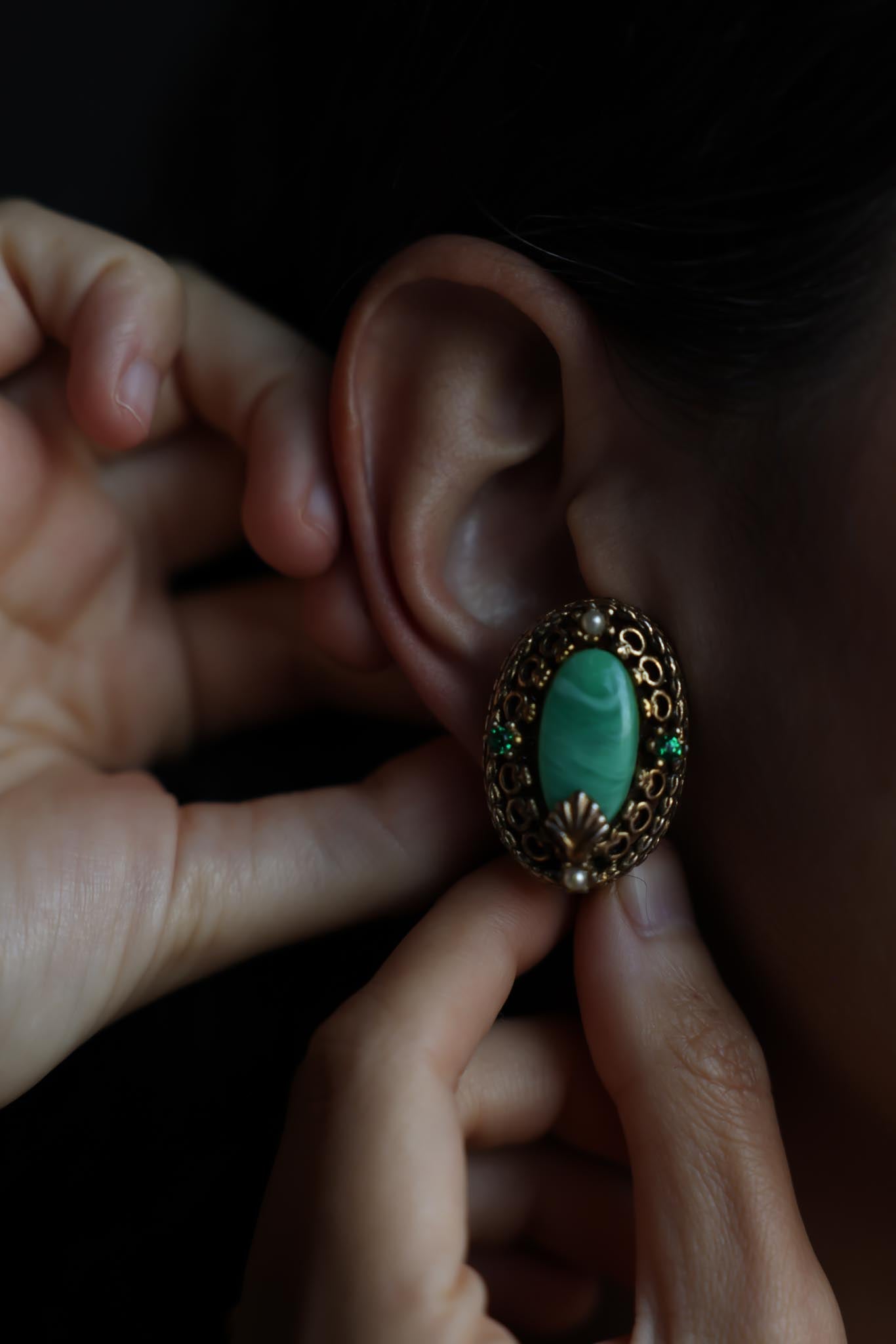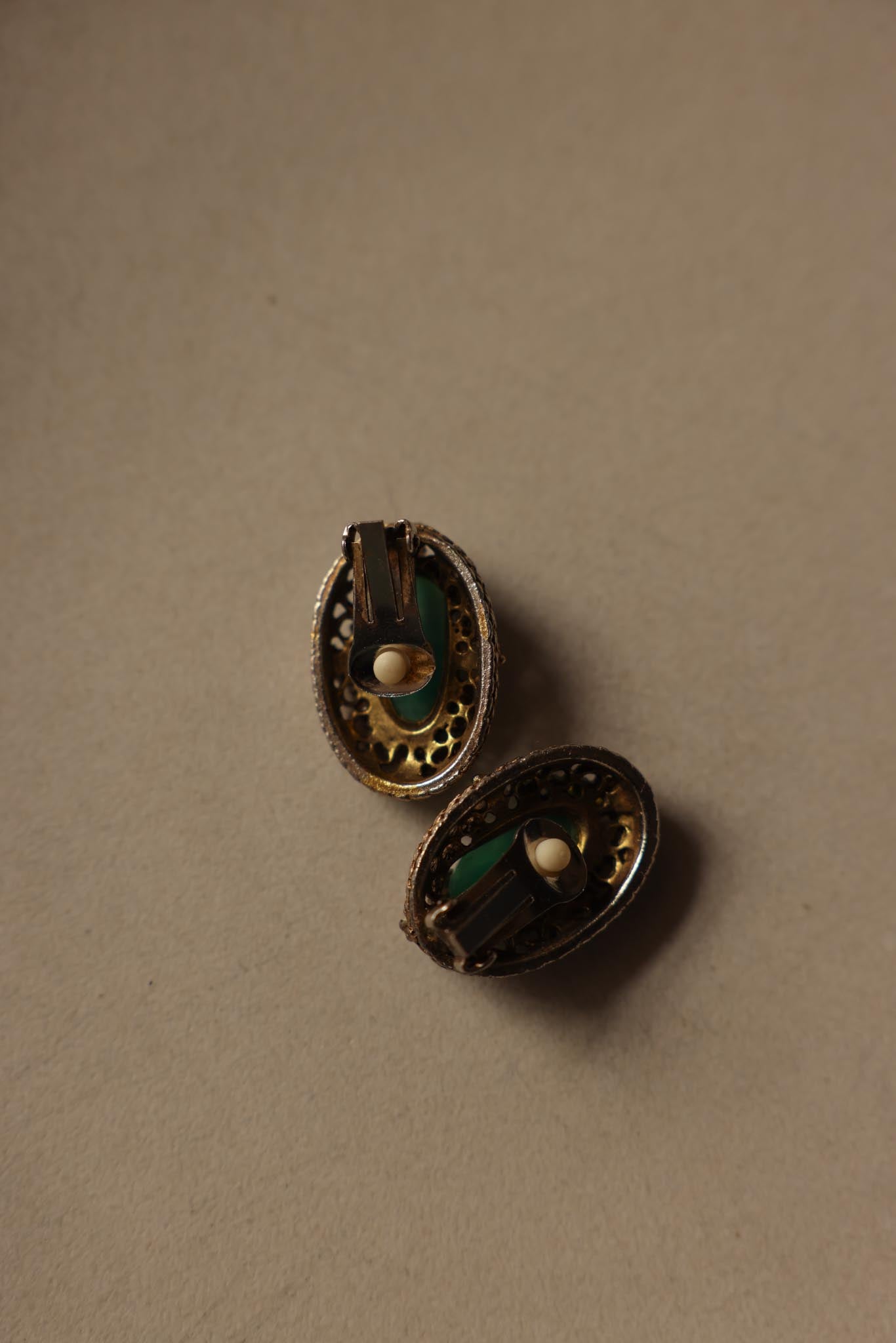 Antique clip-on earrings featuring an ornate gold-tone filigree setting adorned with an oval green cabochon center. Accented with small faux pearls and emerald-green rhinestones, this design captures timeless vintage artistry. Measuring 1.2 inches long and weighing 24g combined, these earrings offer a classic, elegant touch with rich antique charm.