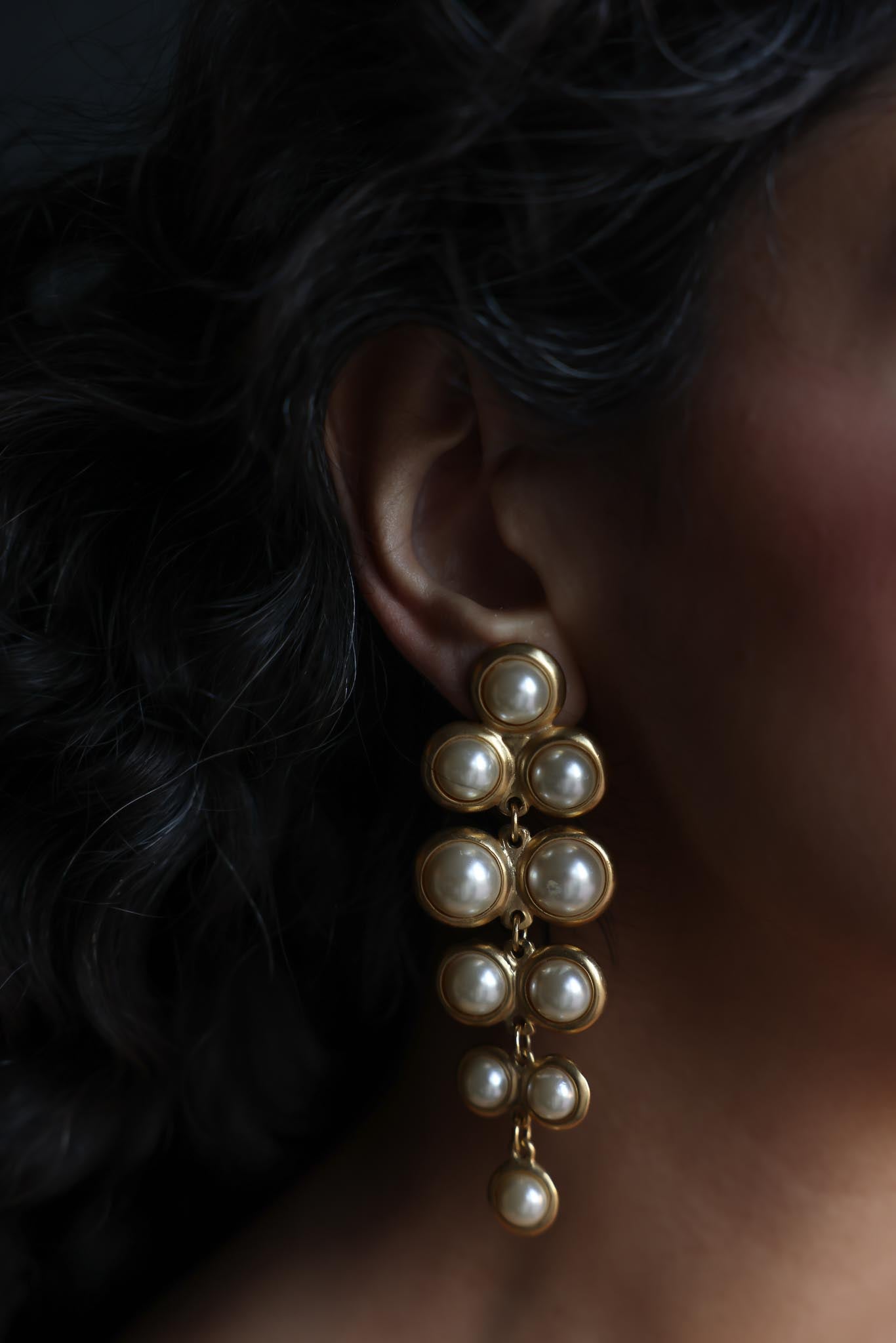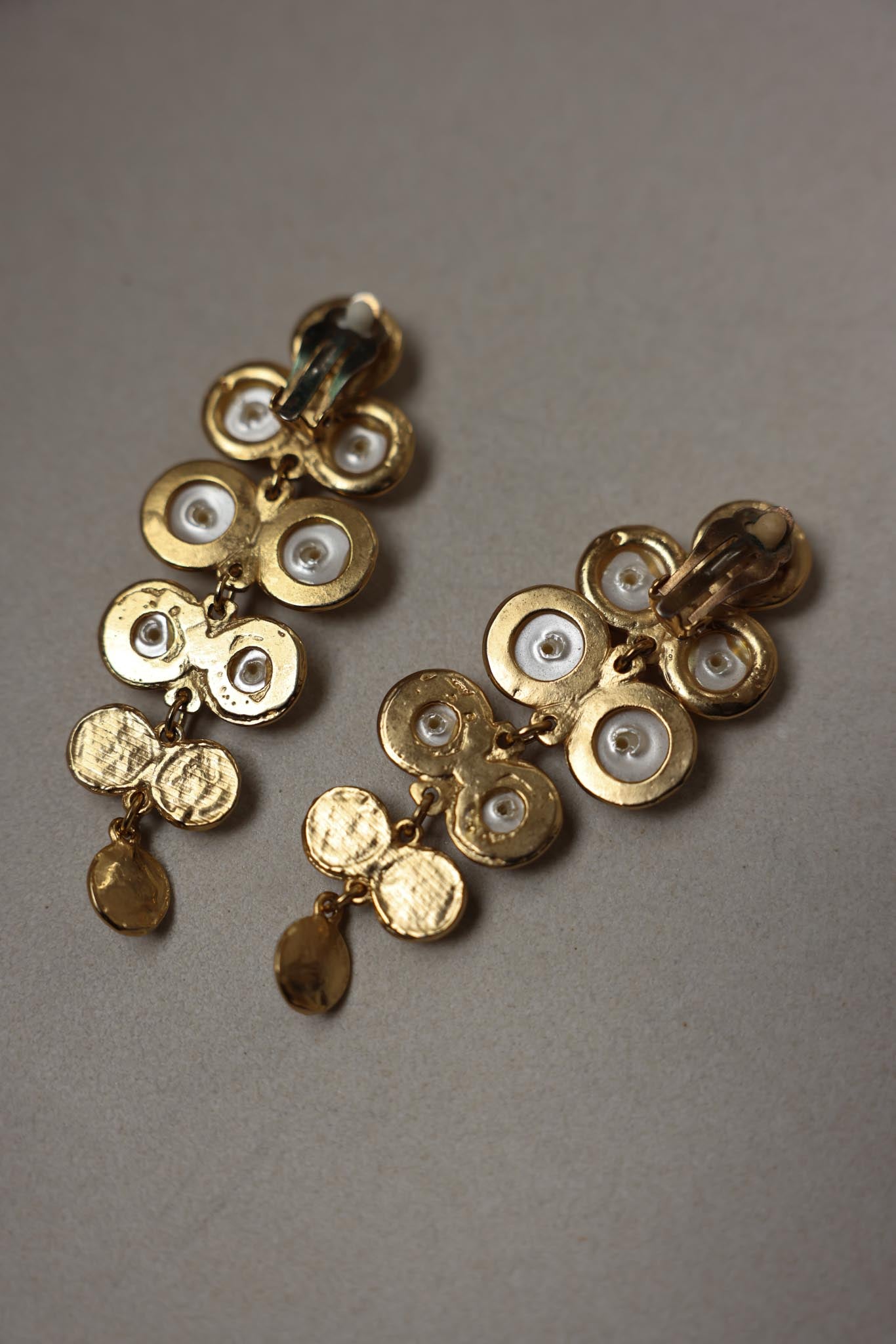 1980s gold-tone clip-on earrings featuring cascading faux pearls in multi-tier circular settings. Measuring 3.6 inches long, these earrings embody the statement glamour of the era with a softly hammered finish and fluid movement. A chic and timeless piece for evening or editorial looks.