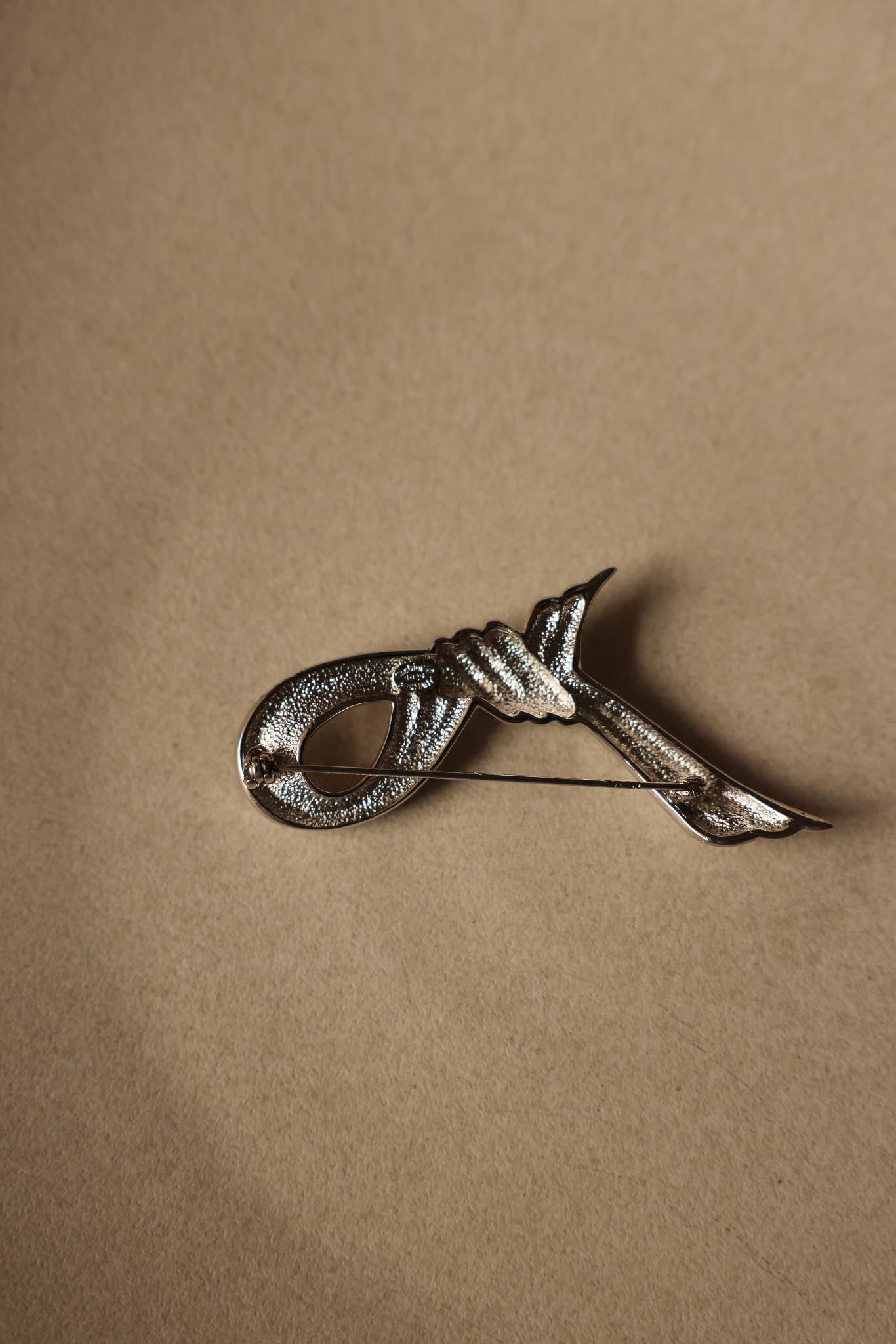 Elegant Christian Dior sterling silver brooch, designed in a flowing ribbon motif. Signed “Christian Dior S925 Germany” on the back, this brooch is crafted from solid sterling silver and weighs 26 grams. Measuring 3 inches long, it features a polished finish with delicate wrapped detailing, embodying timeless sophistication. A stunning collectible from the renowned fashion house, perfect for adding a refined touch to any ensemble.