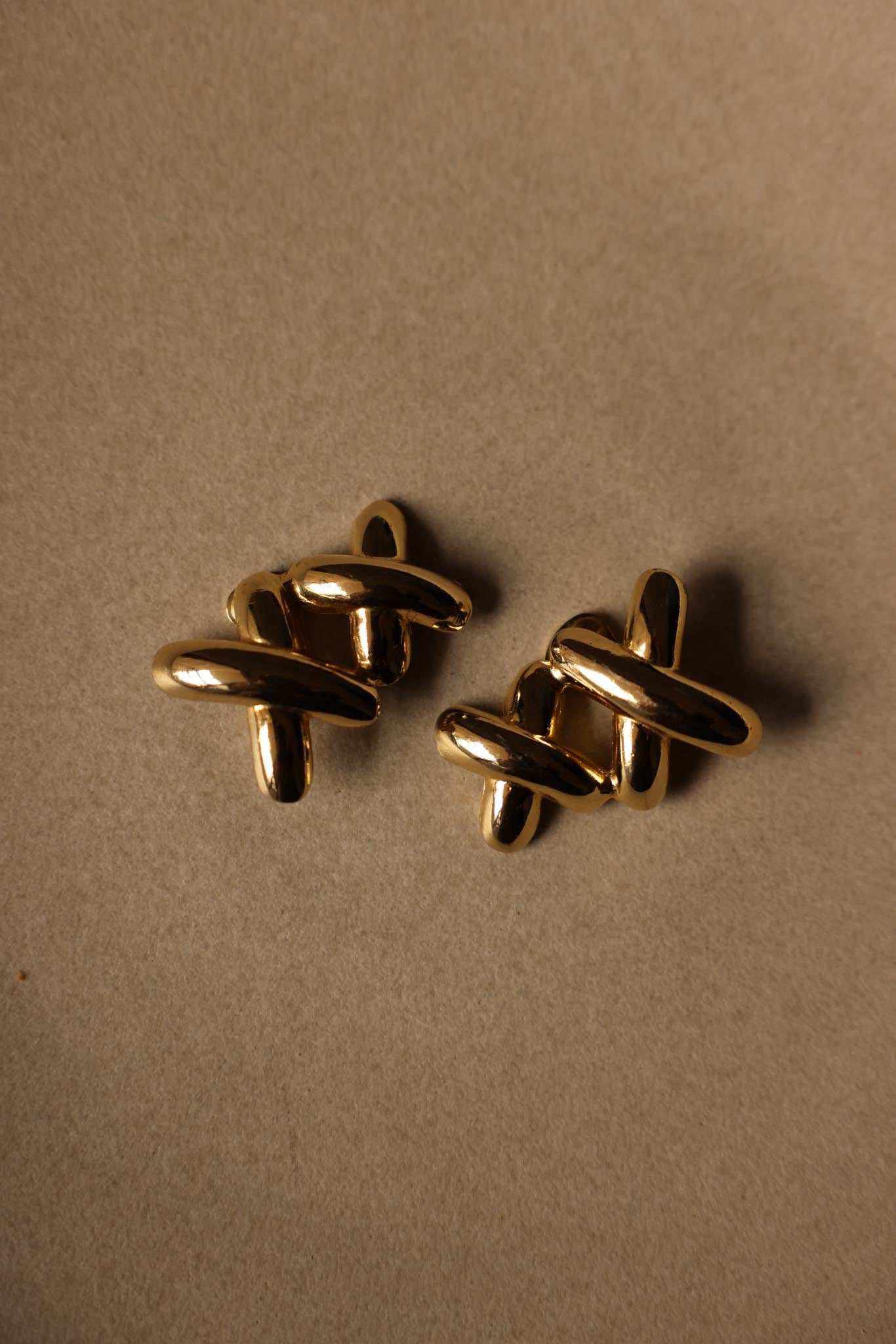 A bold pair of 1980s gold-tone clip-on earrings featuring a sculptural cross-knot design with a smooth, polished finish. The dimensional shape creates a statement look while maintaining a timeless elegance. Measuring 1.5 inches long and weighing 24g combined, these earrings are comfortable to wear and perfect for adding a touch of vintage glamour to any outfit. Secure clip-on backs make them suitable for non-pierced ears.