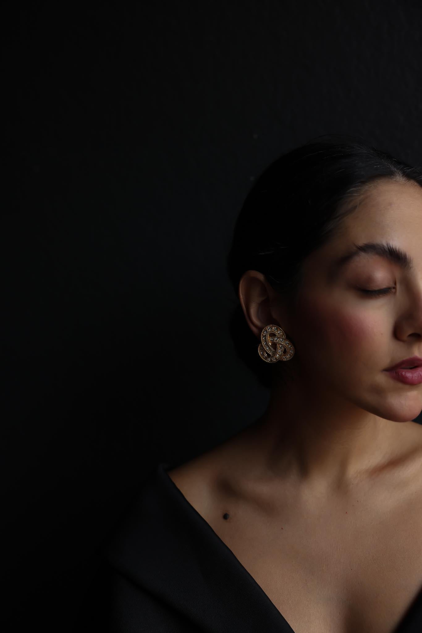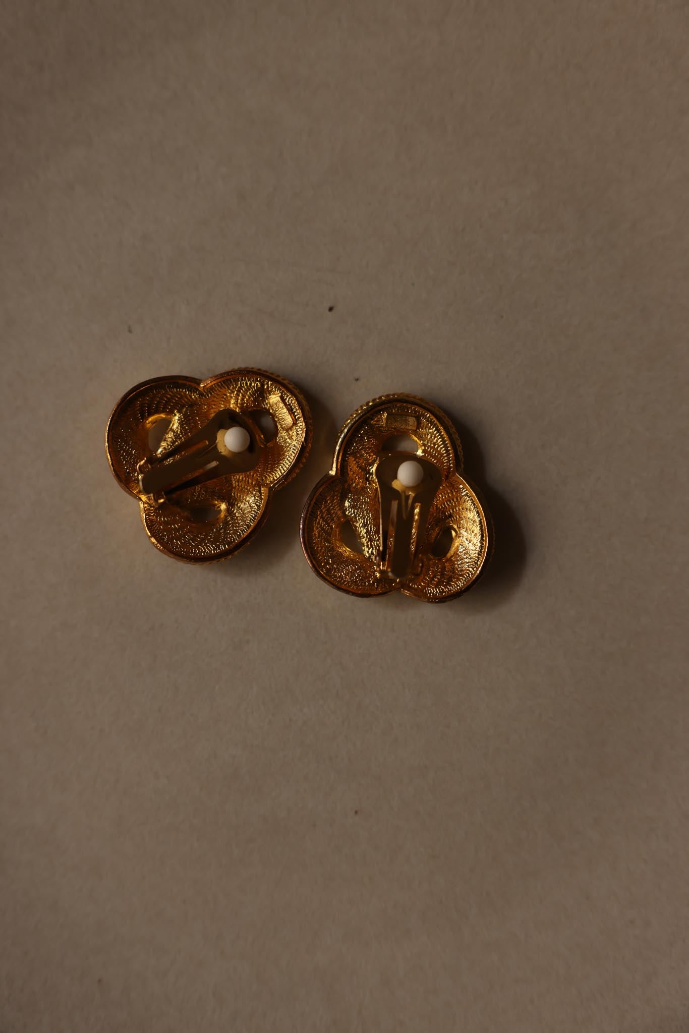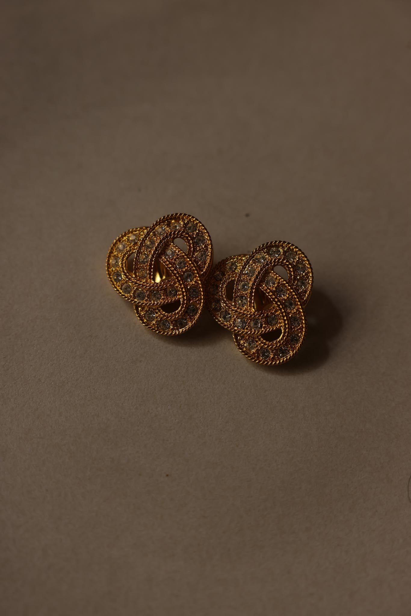 1980s gold-tone clip-on earrings featuring an intricate interlocking knot design adorned with clear rhinestones. The twisted rope edging adds depth and texture, while the radiant stones provide a timeless sparkle. Perfect for elevating both formal and everyday looks.