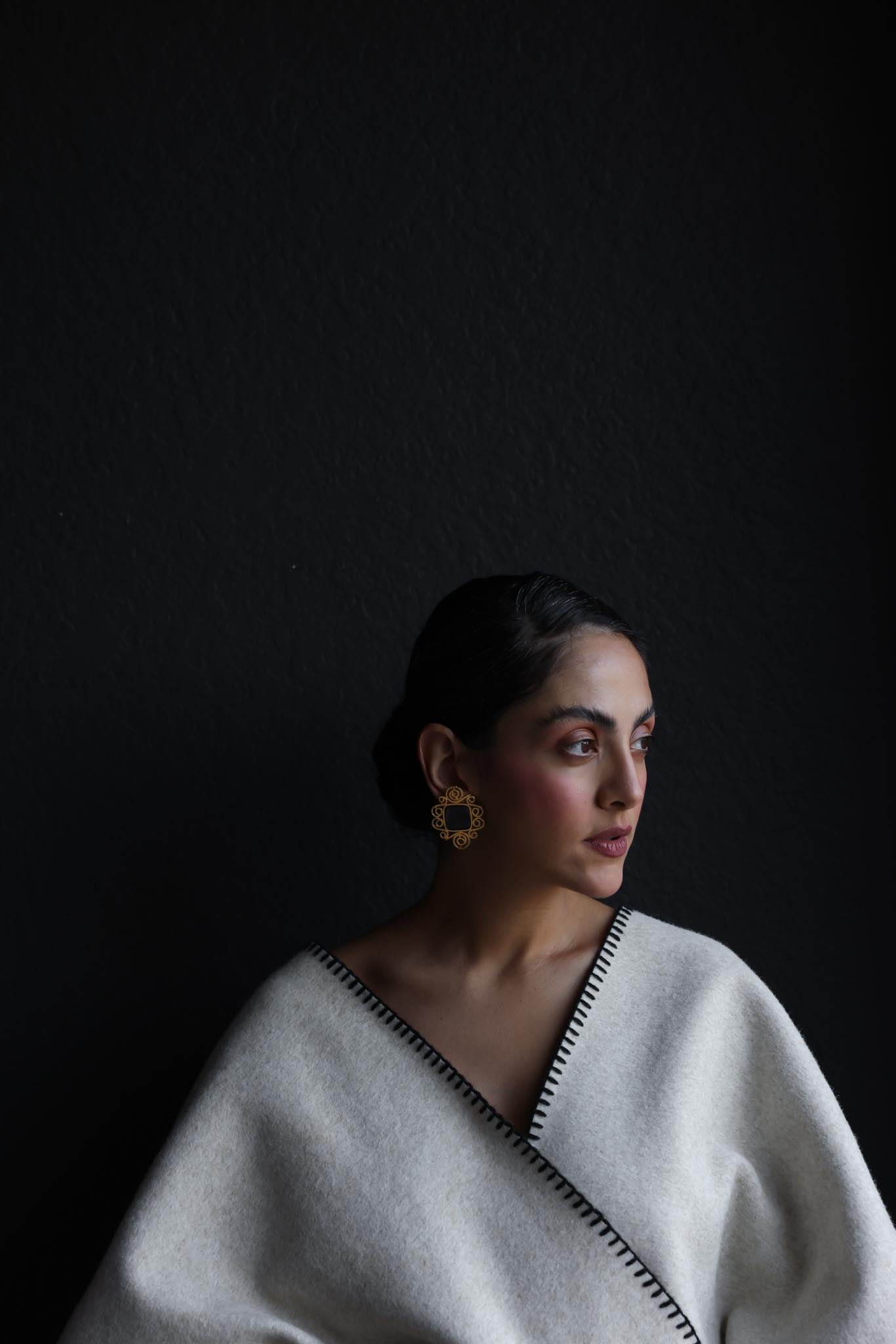 Gold-tone clip-on earrings featuring a bold square black center framed by ornate scrolling metalwork. Their intricate design combines elegance with statement appeal, creating a sculptural silhouette that beautifully frames the face. Measuring 1.7 inches long and weighing 24g combined, these earrings bring a touch of refined drama to any outfit.