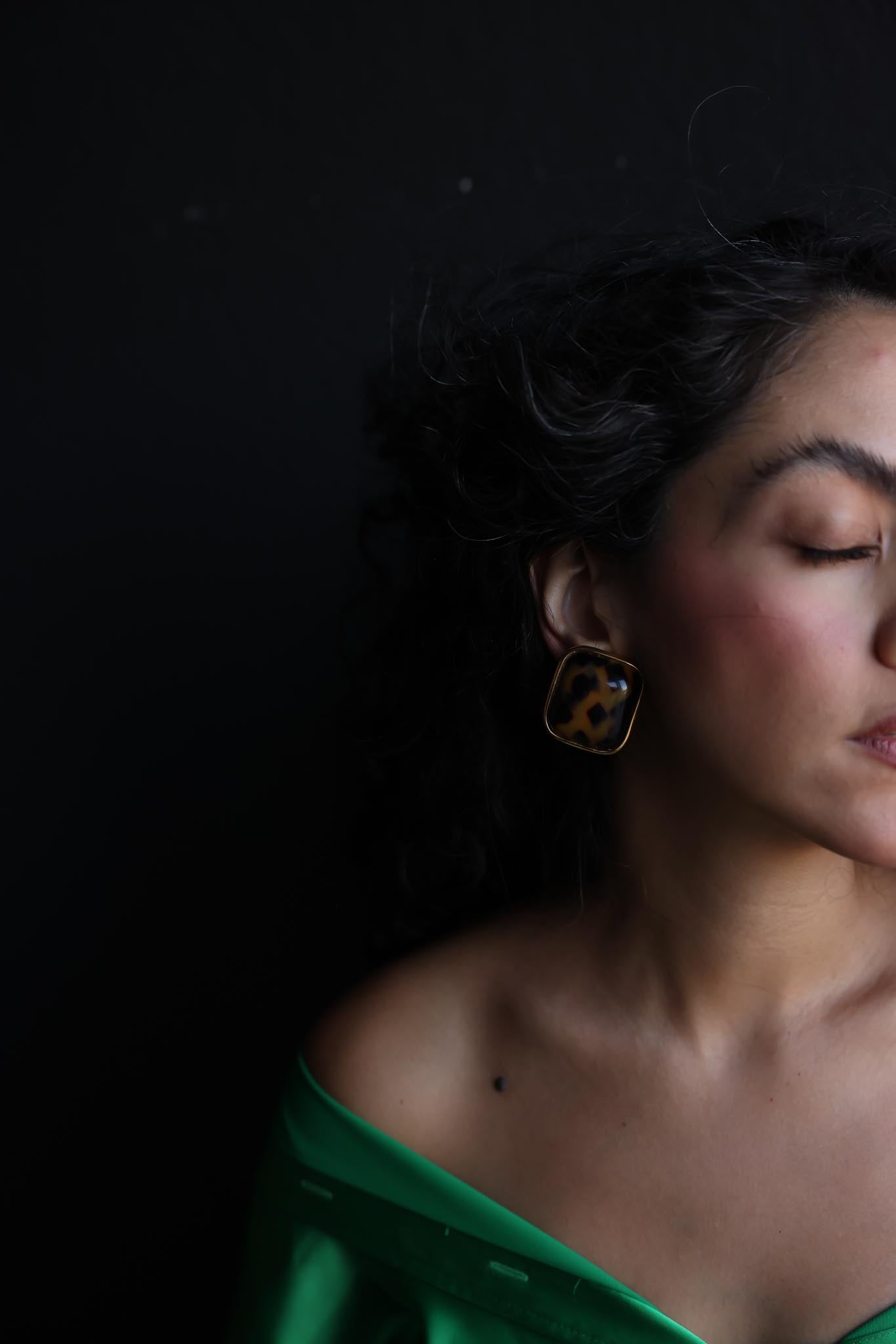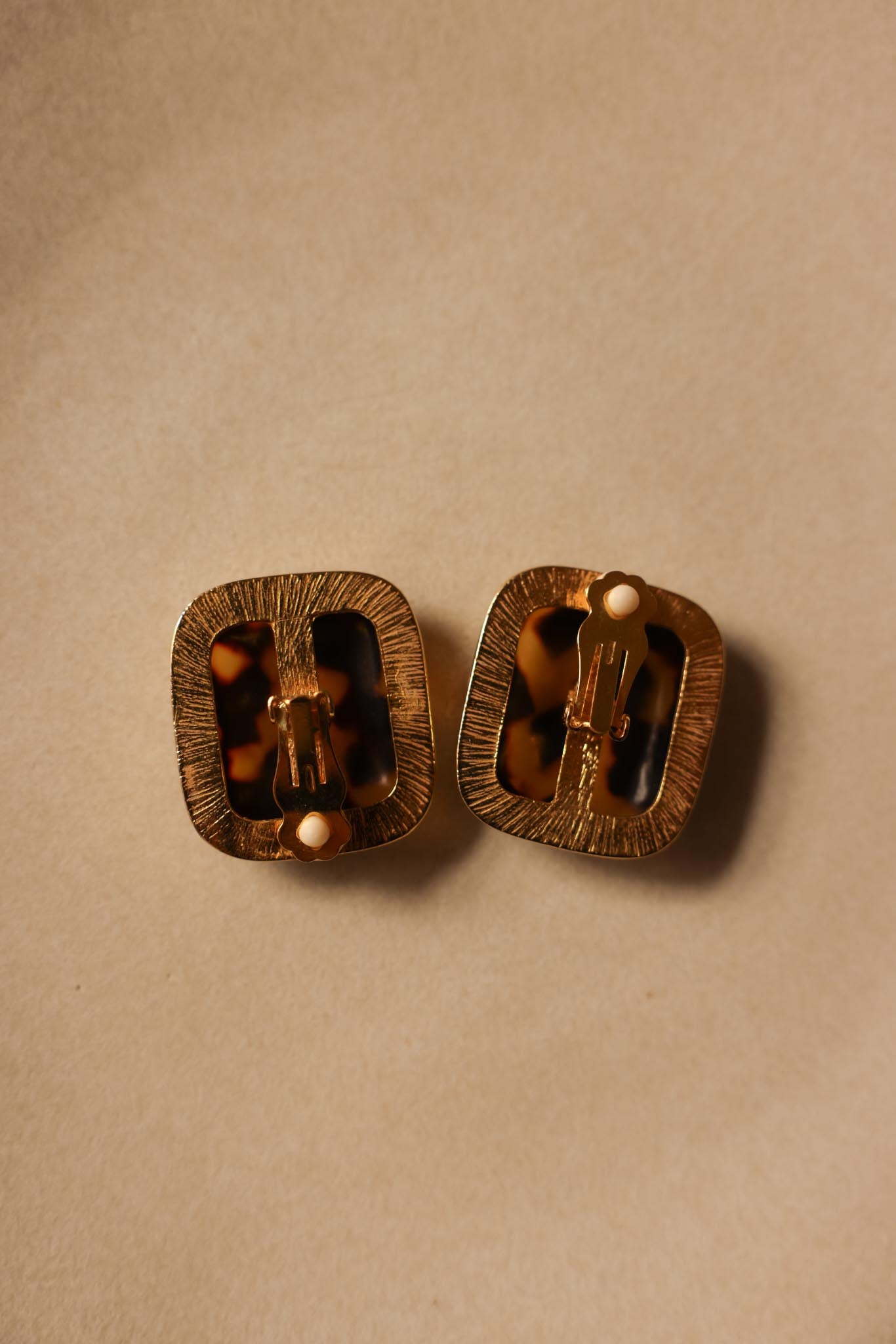A bold pair of 1980s gold-toned clip-on earrings featuring a leopard print design encased in a smooth, domed setting. These statement earrings measure 1.4 inches and weigh 25 grams combined. The rich tortoiseshell-inspired pattern adds a sophisticated, vintage touch, perfect for elevating any outfit.