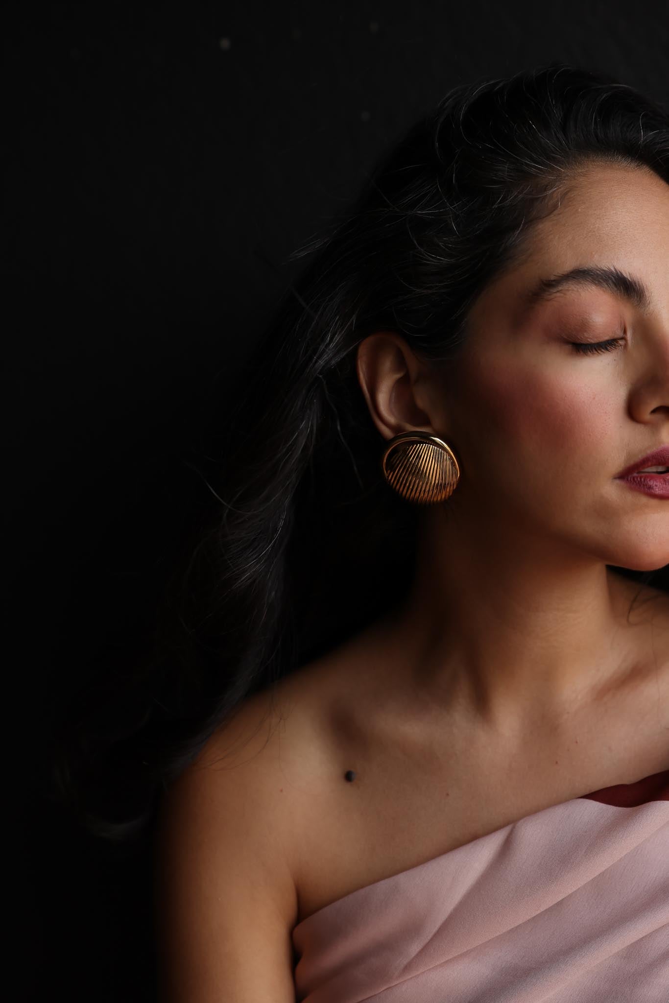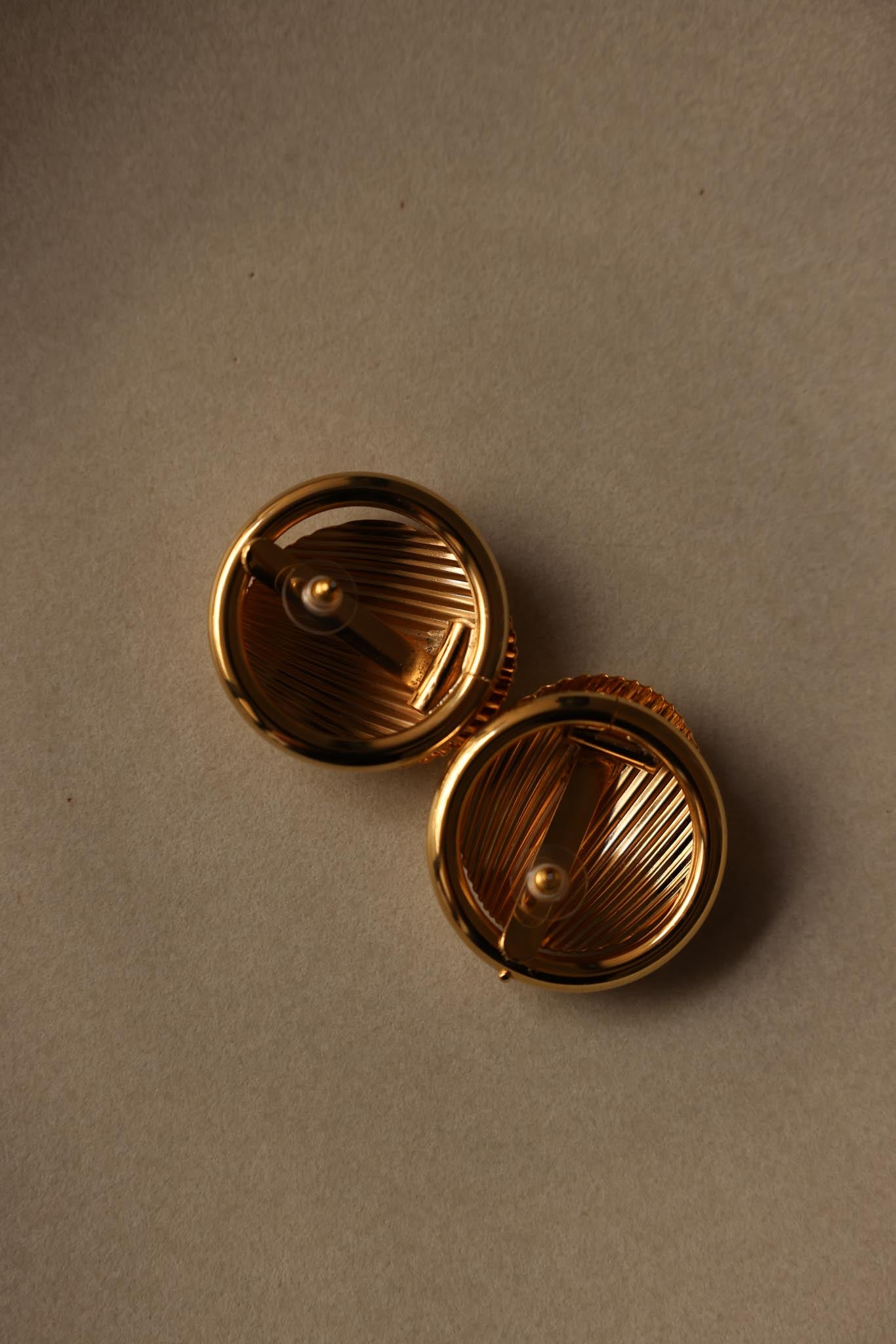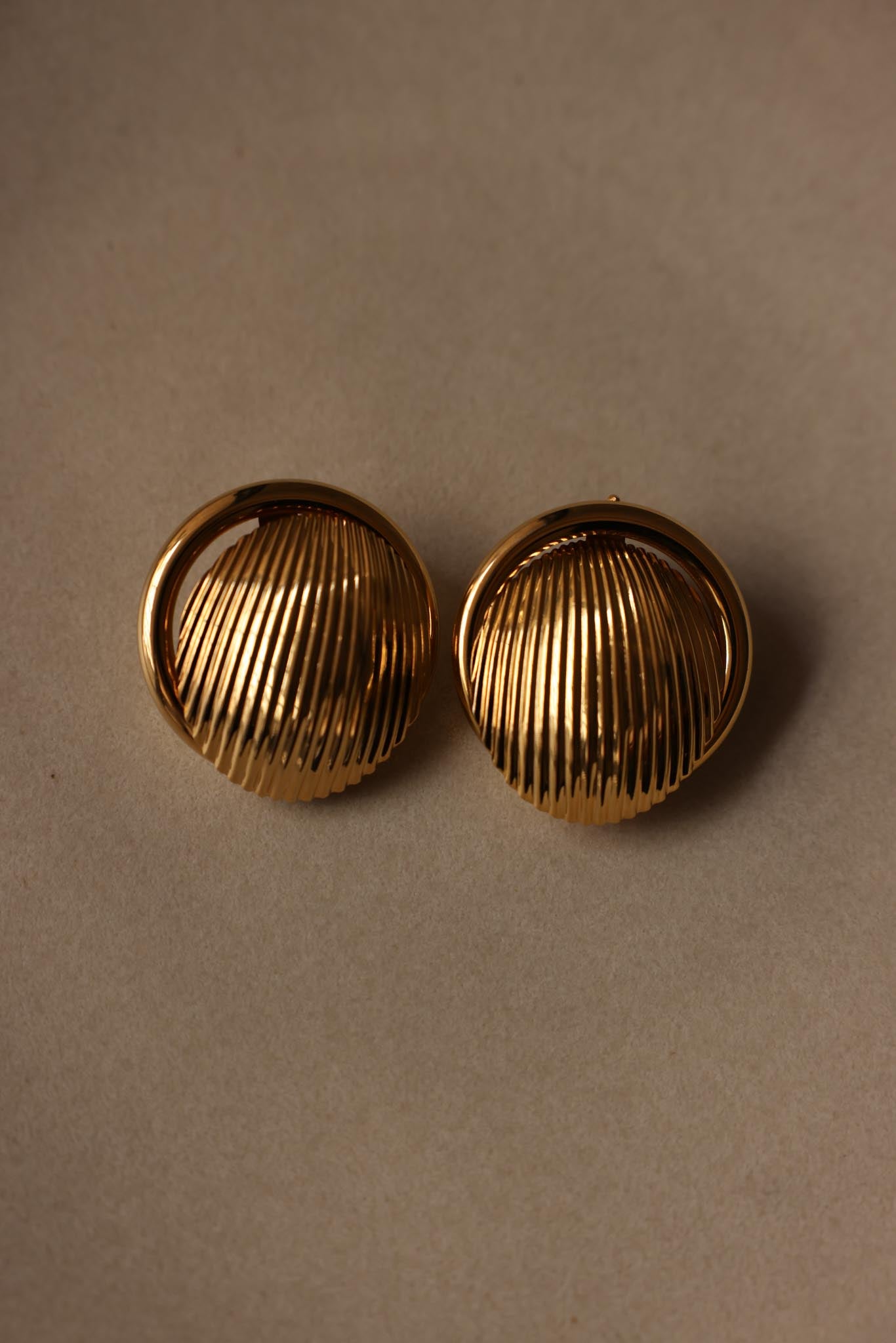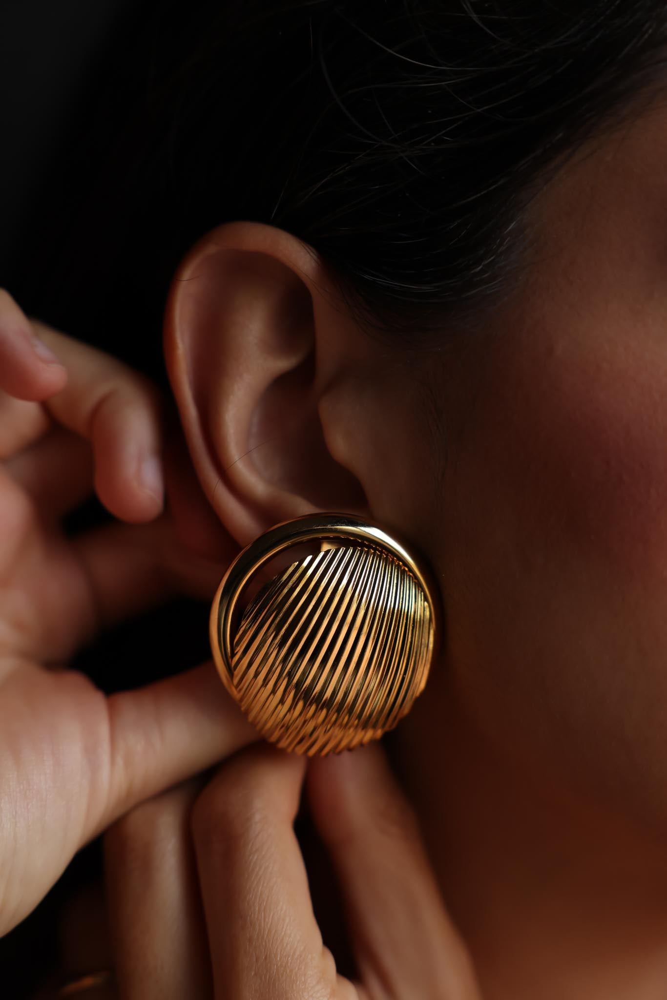 These 1980s pierced earrings feature a sculptural seashell-inspired design in polished gold-tone metal. With textured ridges framed by a smooth circular border, they evoke both elegance and coastal charm. Measuring 1.5 inches and weighing 28g combined, they are a bold yet timeless accessory, perfect for adding a touch of seaside glamour to day or evening looks.