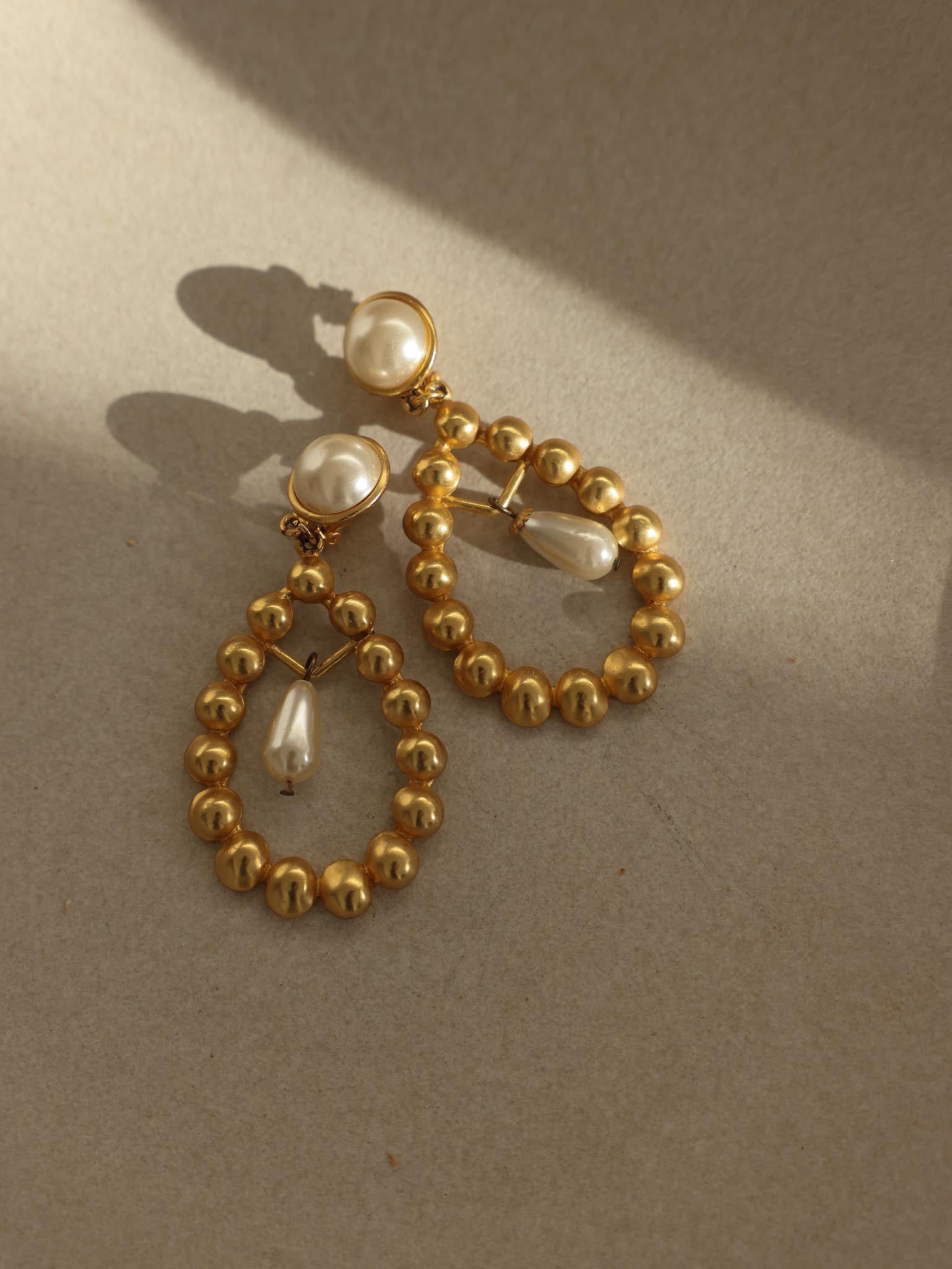 1980s matte gold-plated clip-on earrings featuring a bold beaded teardrop frame with a suspended faux pearl drop. A sculptural, high-impact silhouette that reflects the dramatic glamour of the era while remaining elegant and wearable.