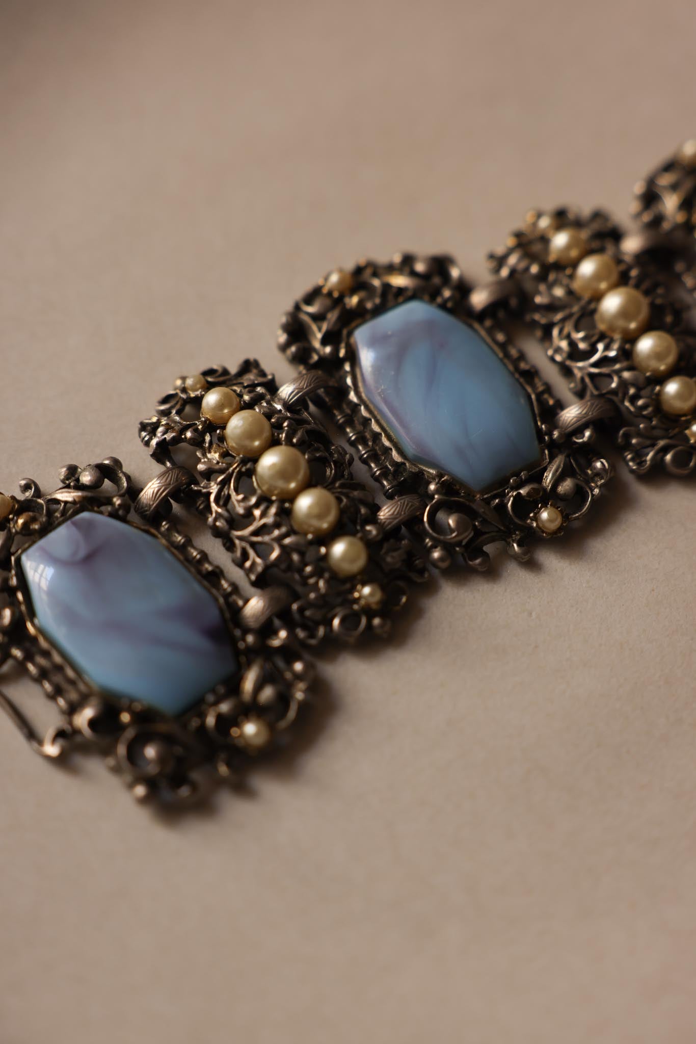 An exquisite antique bracelet featuring alternating segments of ornate silver filigree, faux pearls, and light blue marbled cabochons. The bracelet has a bold, statement-making design with four large cabochon links and pearl-accented links in between. The metal has an oxidized patina that enhances its vintage charm. It weighs 98g, measures 7.6 inches long, and is 2.4 inches wide. Estimated to be from the 1930s or 1940s.