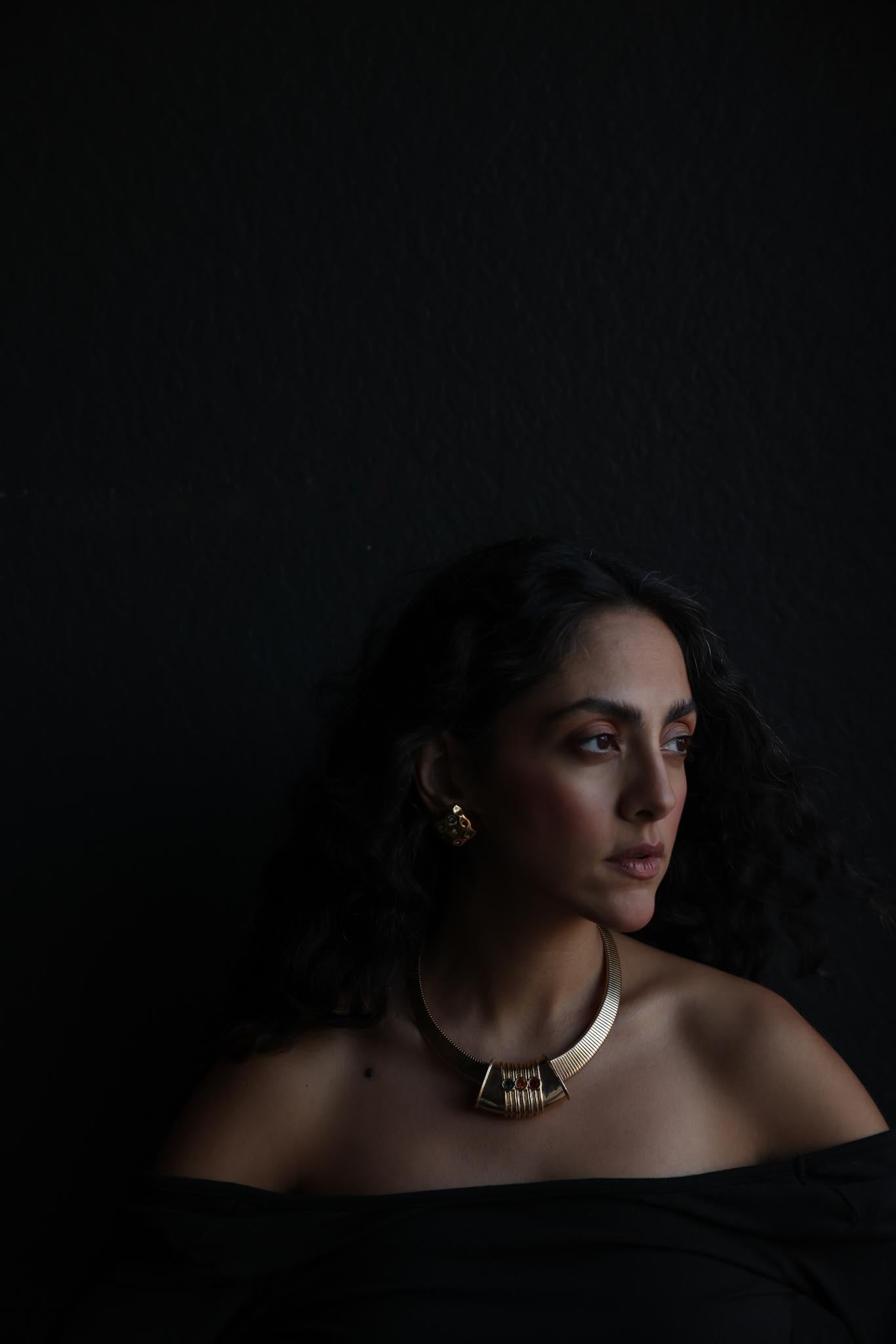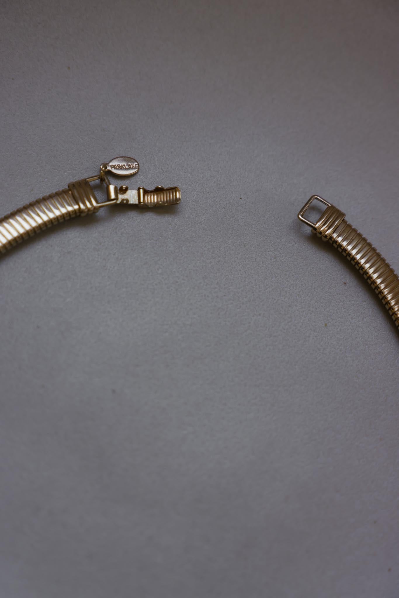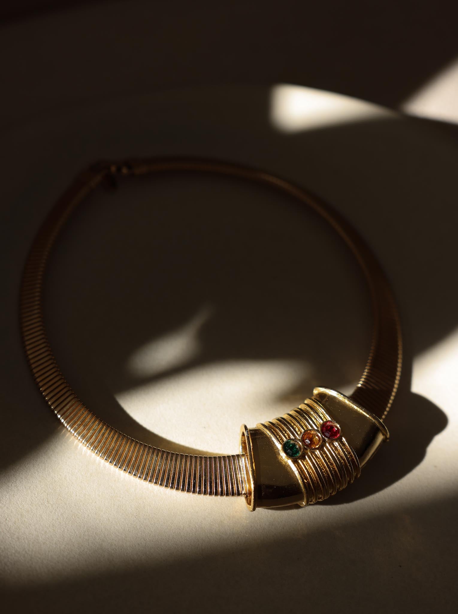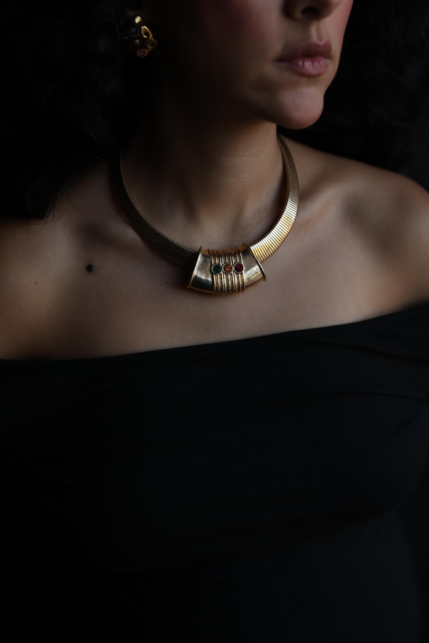Signed Park Lane omega chain necklace featuring a bold gold-tone design with a structured, polished finish. The centerpiece showcases three round faceted rhinestones in red, amber, and green tones, set against a ribbed metal accent. This piece measures 17.5 inches long and weighs 90g, offering a sleek statement look typical of 1980s jewelry design.