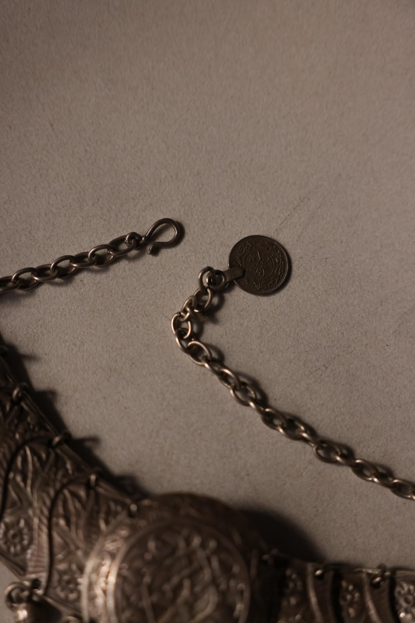 Bold and striking, this silver-tone choker necklace features intricate engraved medallion-style links adorned with dangling bead details. At its center, a round medallion drops into a striking turquoise-colored cabochon pendant, adding a vibrant pop of color. The adjustable chain allows the necklace to be worn between 8.5 and 17 inches, making it versatile for different necklines. Weighing 114g, this piece is substantial and makes a true statement, perfect for adding an exotic and artistic touch to your collection.