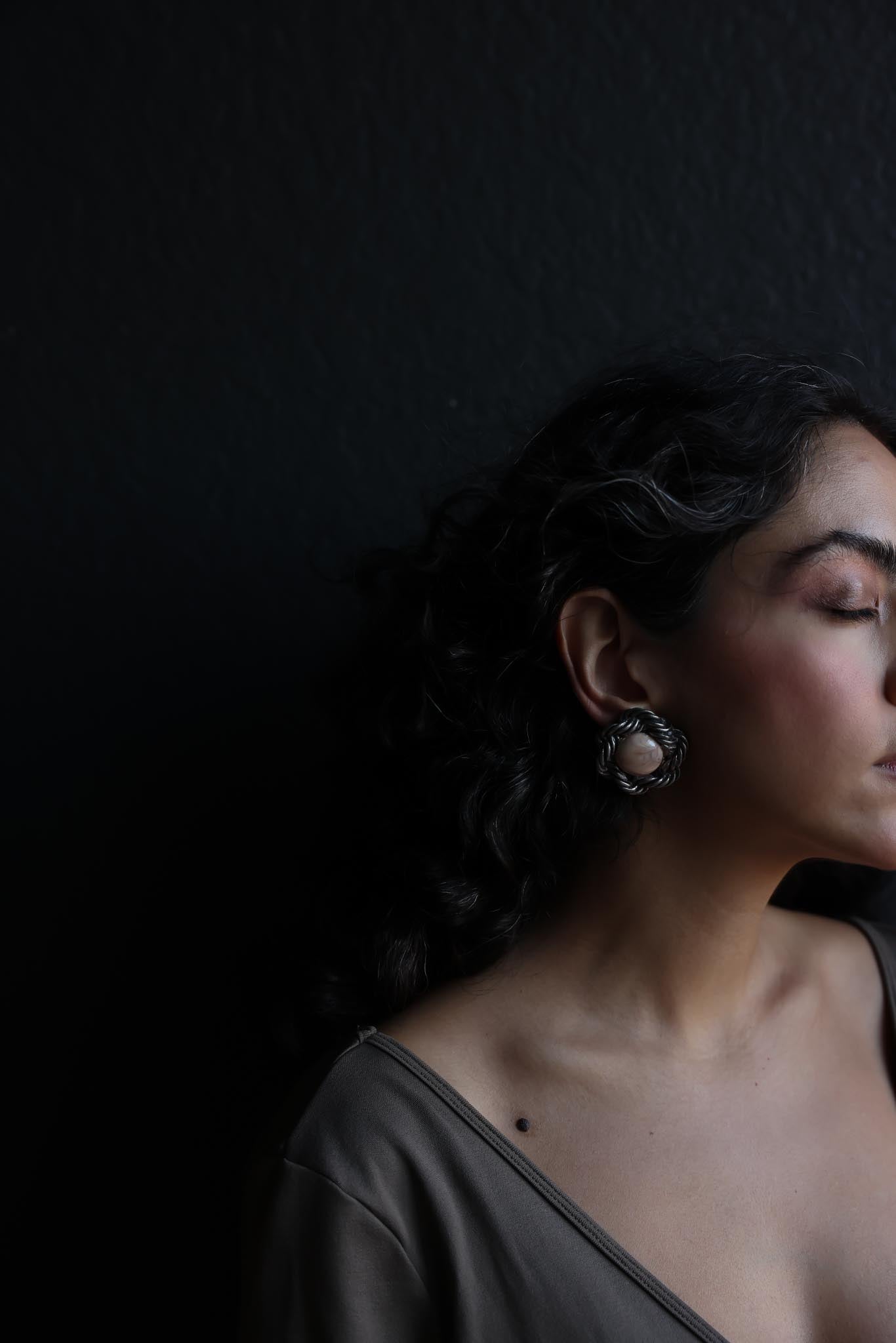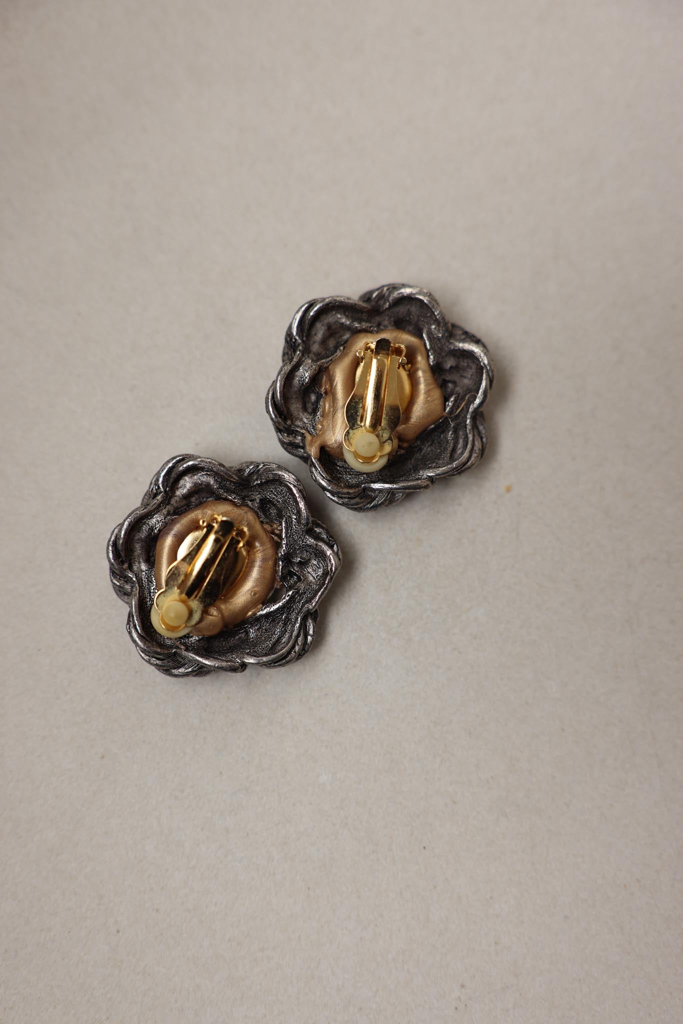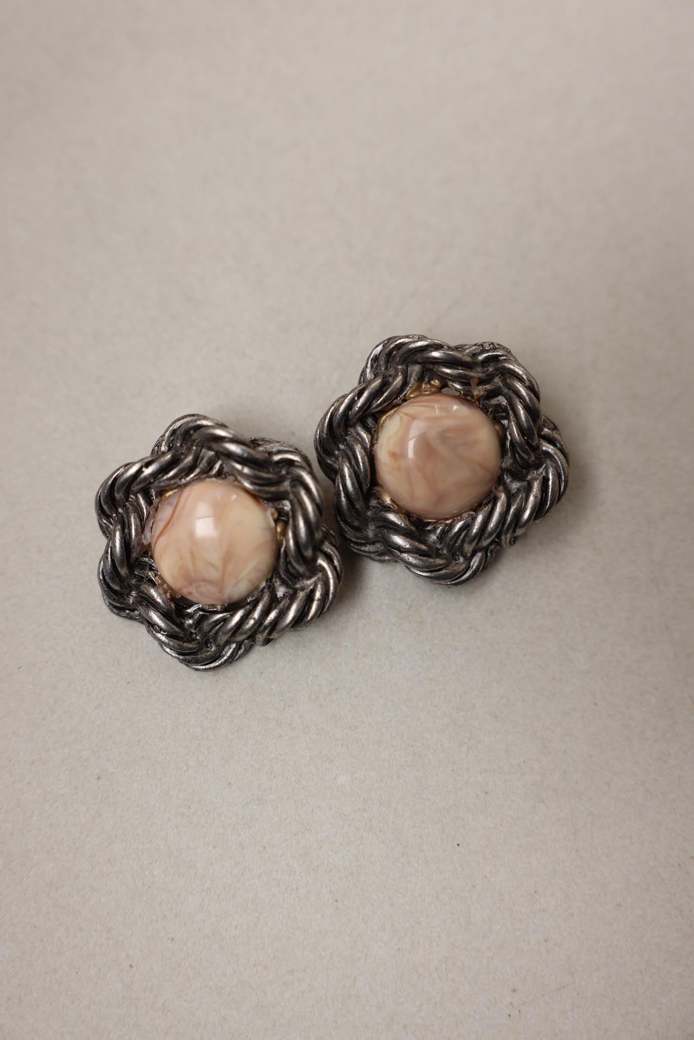 1980s clip-on earrings featuring a sculpted silver-tone twisted rope design surrounding soft light pink marbled cabochon centers. The dimensional metalwork gives the earrings a bold yet refined look, perfect for both day and evening wear.