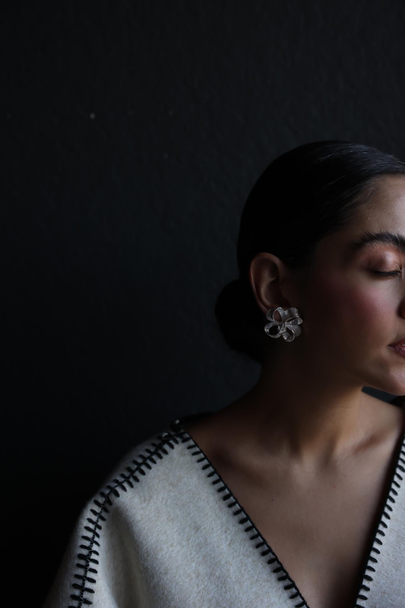 Silver-tone clip-on earrings featuring a sculptural ribbon-style flower design with softly curved petals and a textured finish. Each petal catches the light beautifully, adding dimension and shine. Measuring 1.5 inches long and weighing 28g combined, these earrings make a striking yet elegant statement — perfect for both day and evening wear.