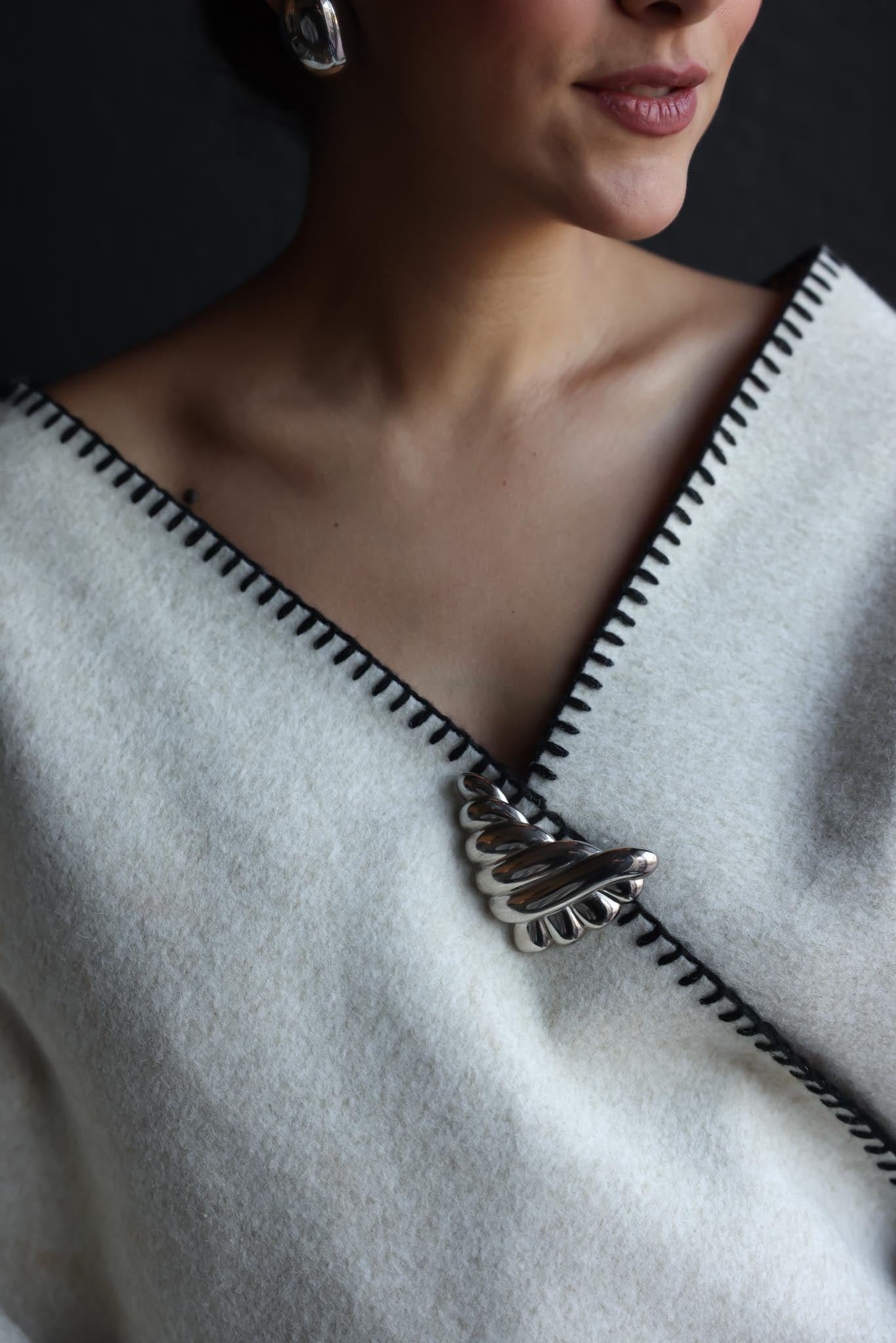 Striking silver-tone brooch with a smooth, sculptural design reminiscent of twisted shell or ribbon forms. This statement piece from the 1980s adds a bold and modern touch to coats, blazers, or knitwear. Measuring 2.6 inches long and weighing 36g, it offers a polished, high-shine finish that catches the light beautifully from every angle.