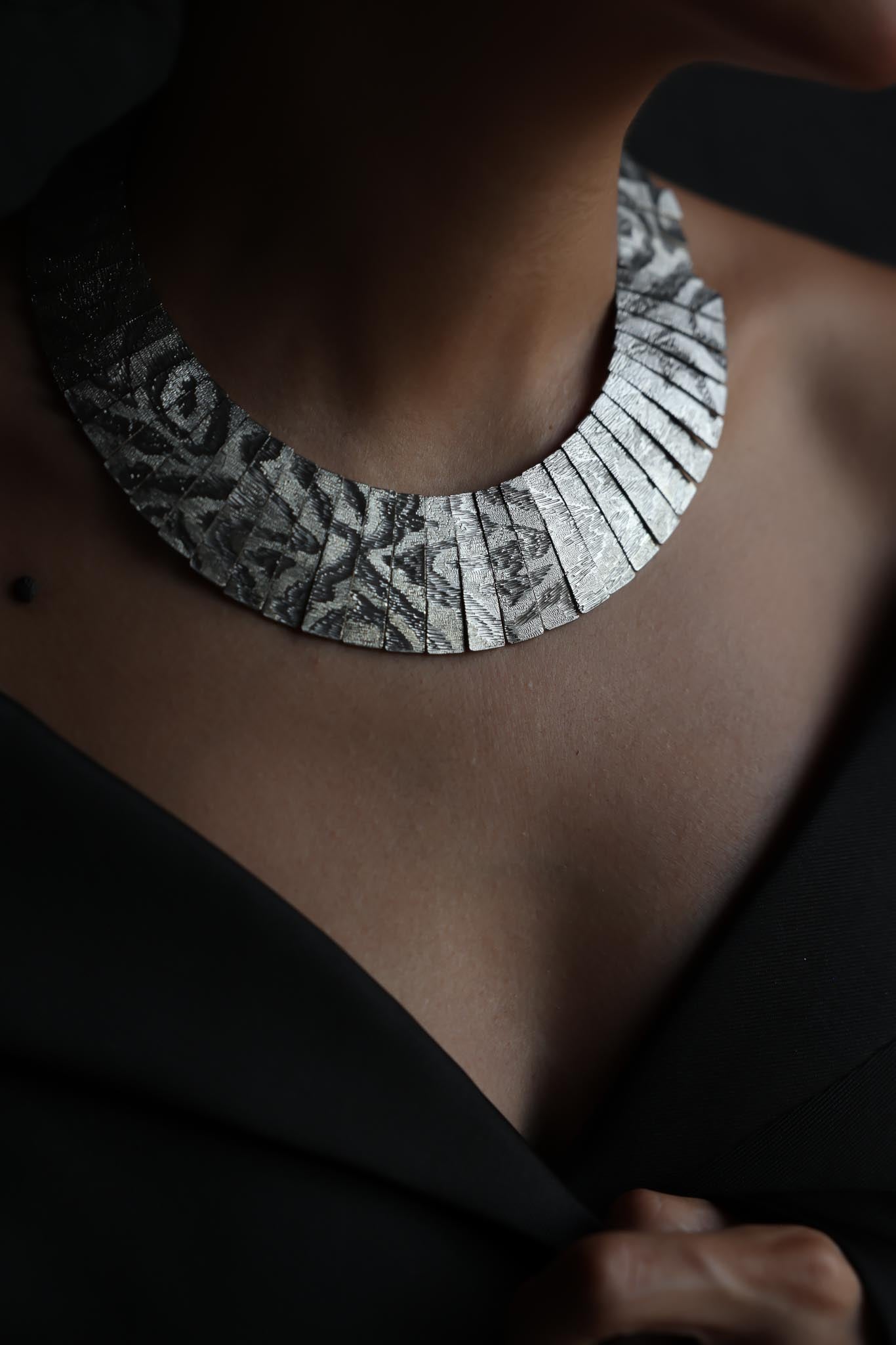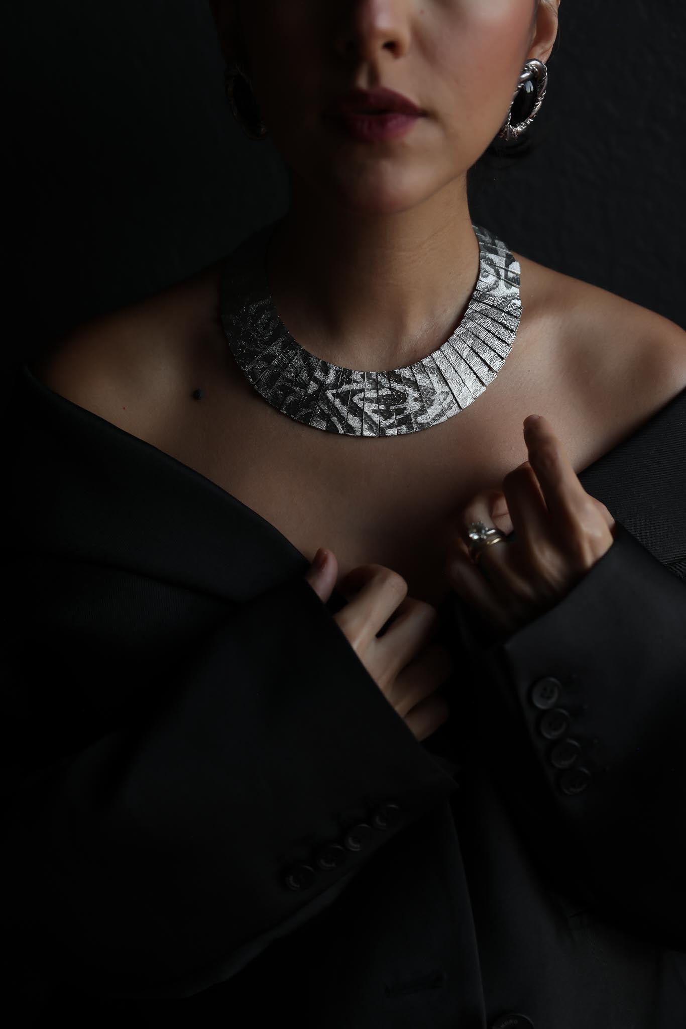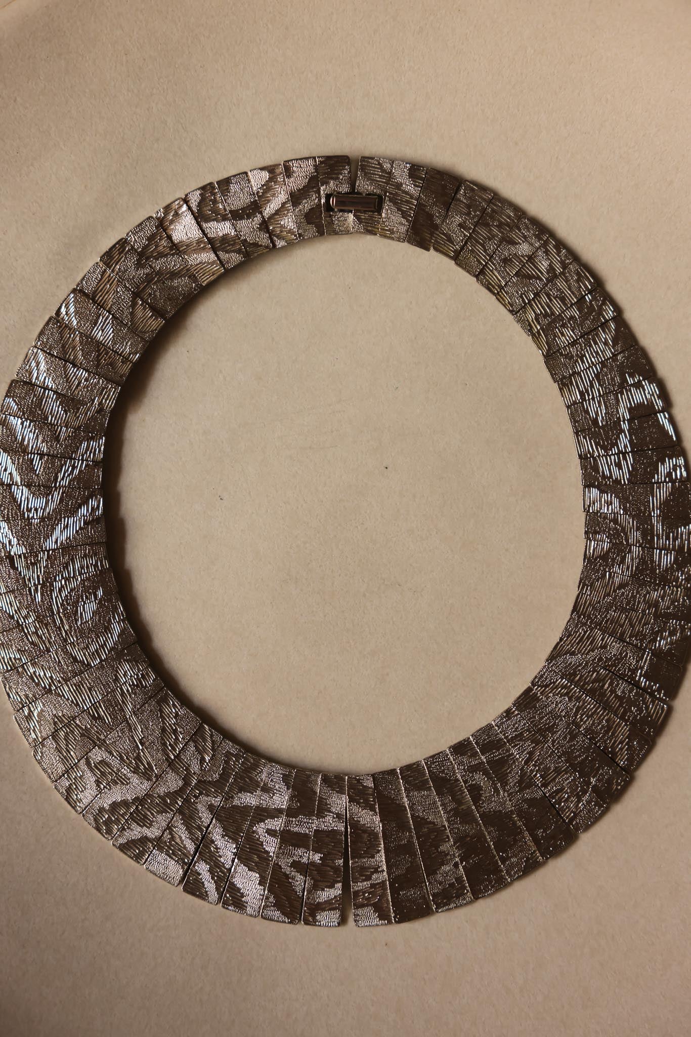 Unsigned Les Bernard silvertone collar necklace featuring a bold, textured design with an intricate geometric pattern. The necklace measures 17.5 inches long and weighs 178g, giving it a substantial and dramatic presence. A striking example of Les Bernard’s craftsmanship, this piece makes a powerful statement and pairs beautifully with both evening wear and modern tailoring.