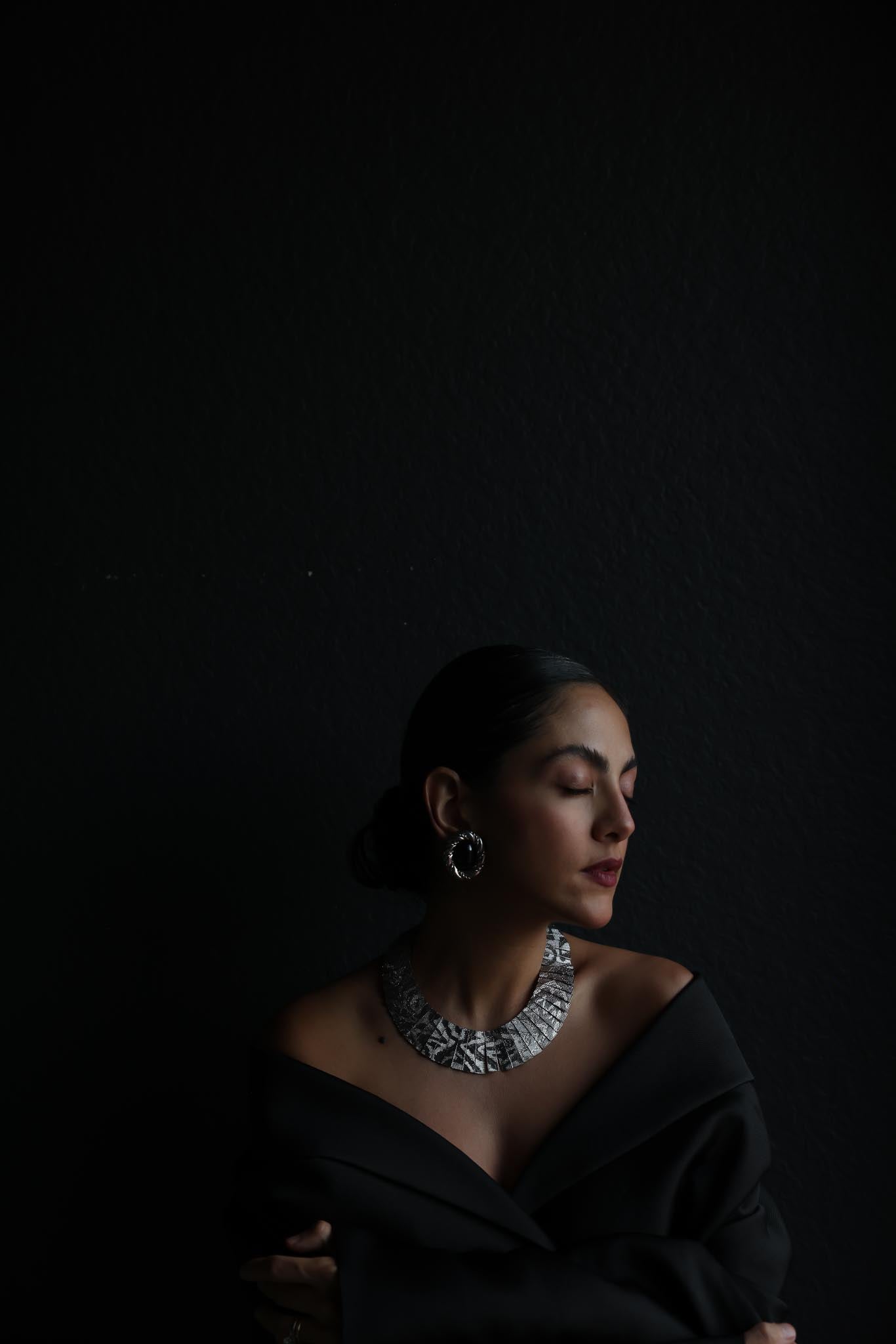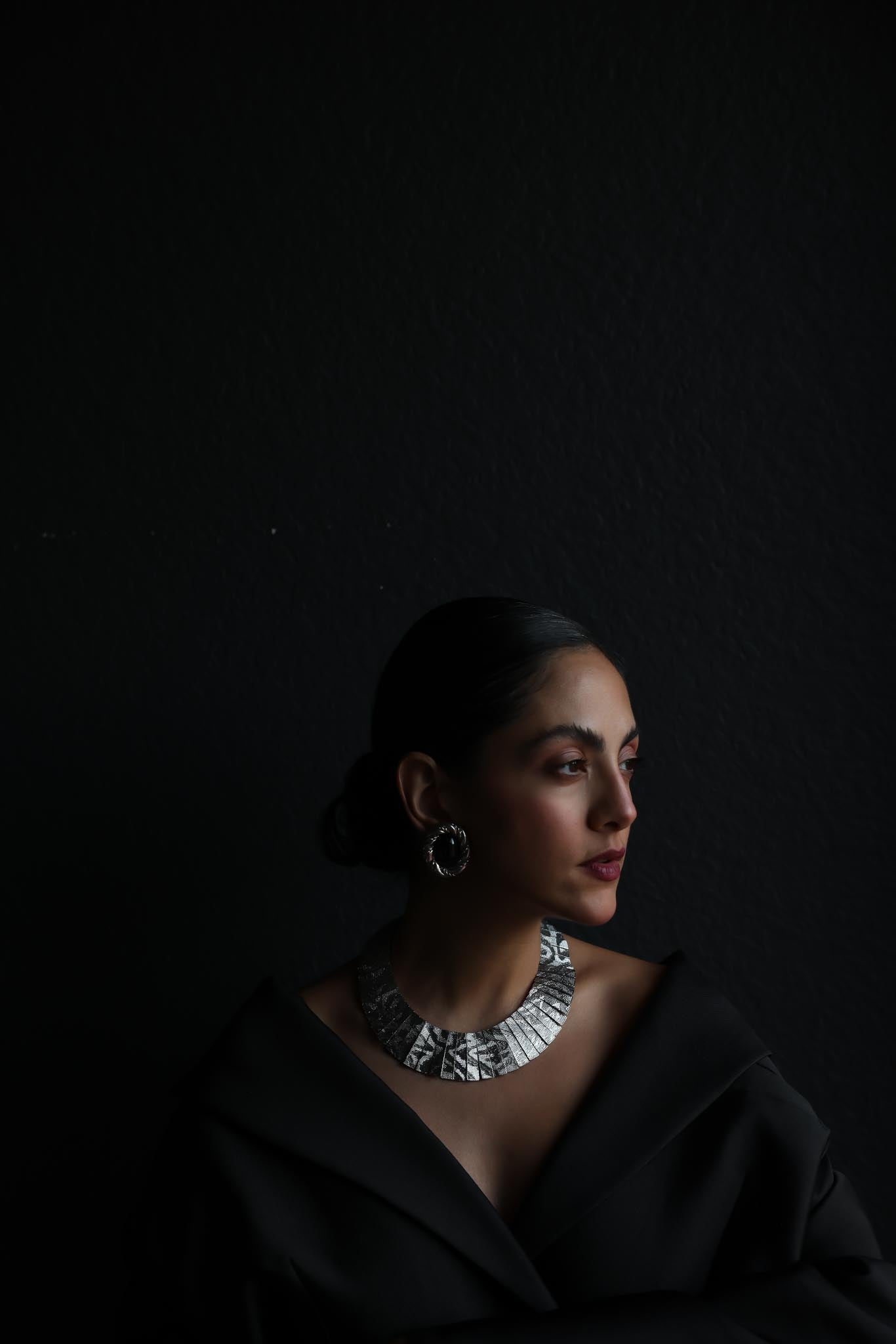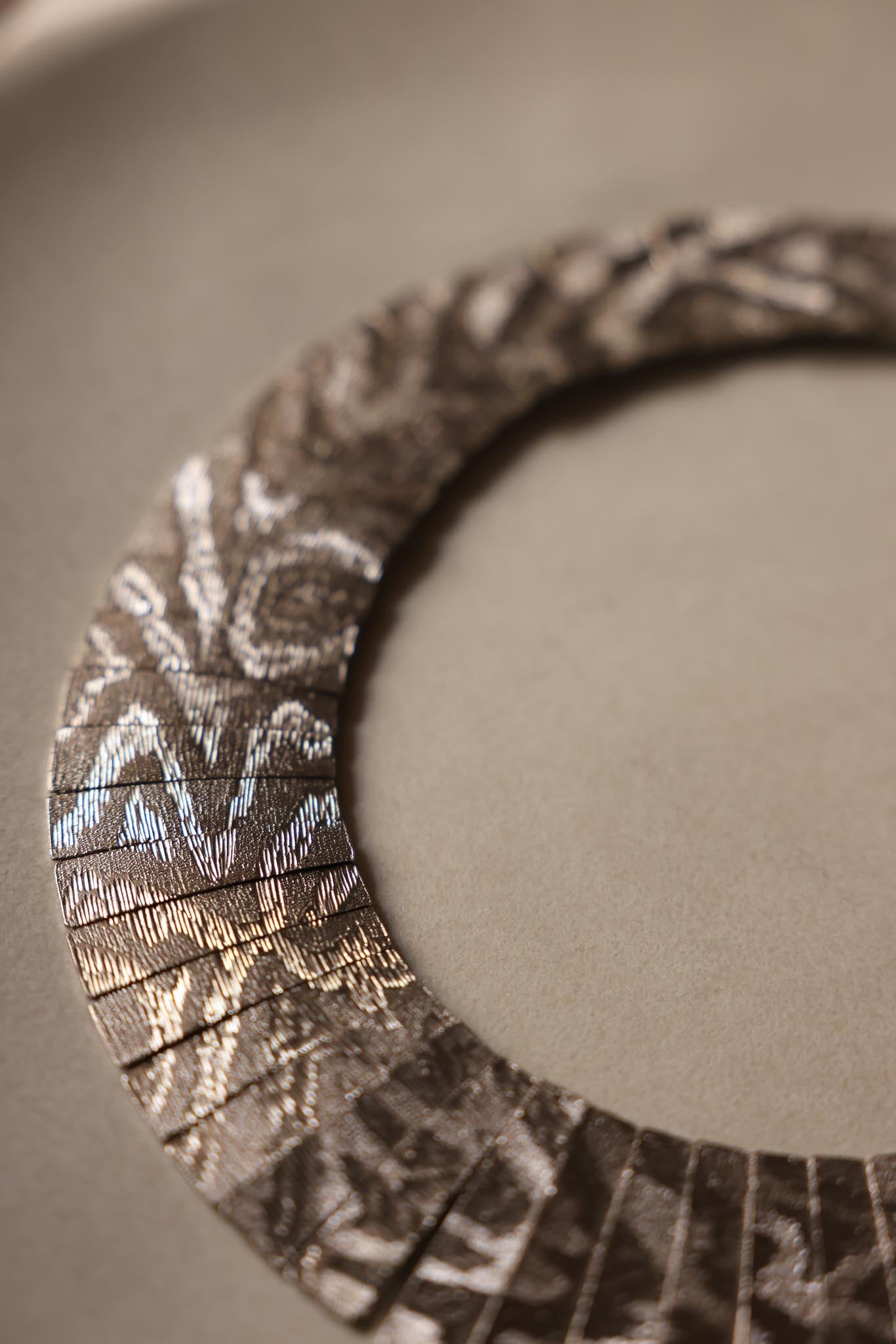 Unsigned Les Bernard silvertone collar necklace featuring a bold, textured design with an intricate geometric pattern. The necklace measures 17.5 inches long and weighs 178g, giving it a substantial and dramatic presence. A striking example of Les Bernard’s craftsmanship, this piece makes a powerful statement and pairs beautifully with both evening wear and modern tailoring.
